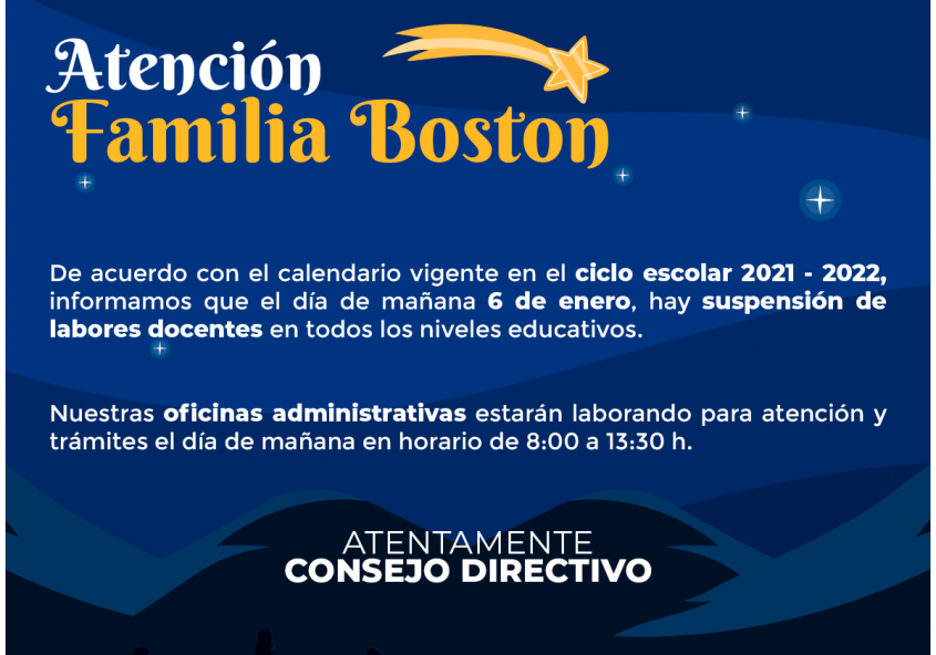Apreciable Familia Boston. Por este medio queremos informarles que por disposición oficial y de acuerdo con el calendario escolar del ciclo 2021 – 2022, el día jueves 6 de enero tendremos suspensión de labores docentes en todos los niveles educativos. Nuestras oficinas administrativas estarán laborando este día en horario de 8:00 a 13:30 h, para…