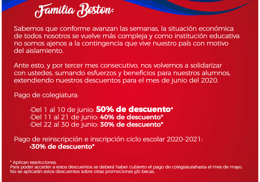 En el Colegio Boston nos hemos distinguido por ser un colegio cercano y empático con nuestros padres de familia y alumnos. Y ante una situación de emergencia como es la generada por la pandemia del COVID – 19, nos hemos puesto la camiseta de nuestros padres de familia, teniendo diferentes beneficios en las colegiaturas sin dejar…